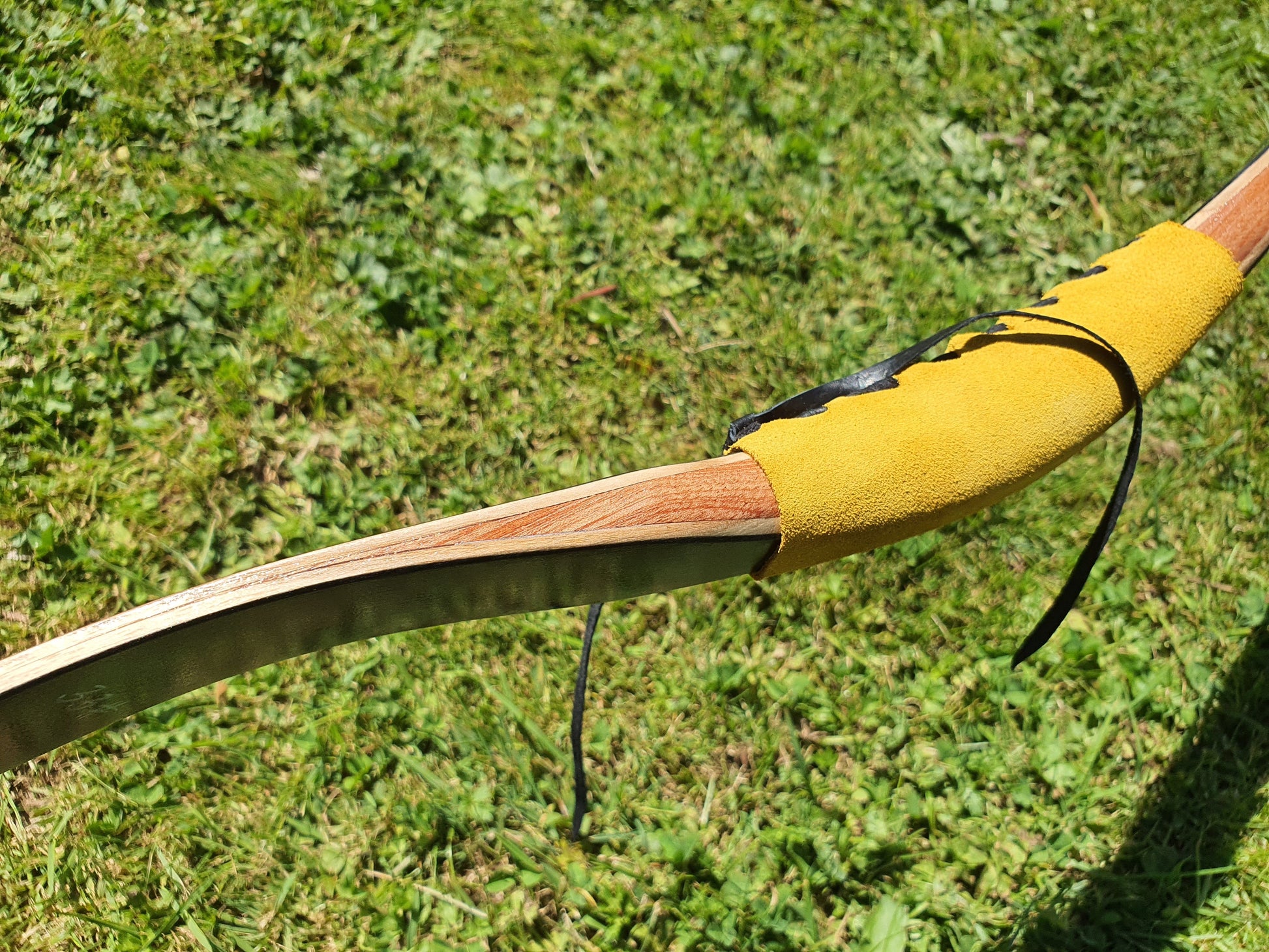 5. Hand protection - Traditional bows such as this one rely on the arrow resting on the side of the bow, and once in-flight the feather of the arrow can graze the fleshy part of your hand between your thumb and index finger. It is highly recommended to place a piece of leather here, or to use a dedicated hand guard/glove to avoid feather cuts.